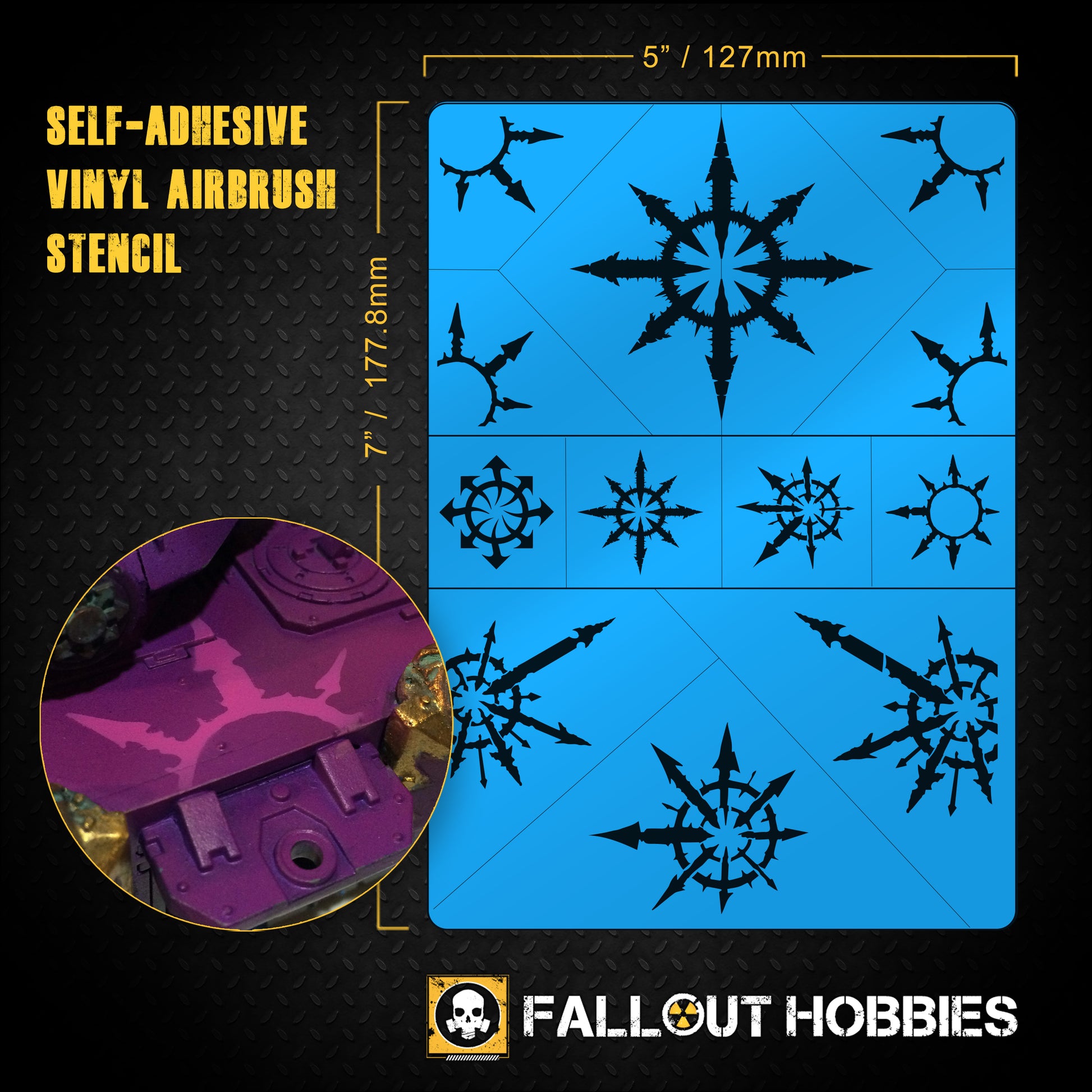 Fallout Hobbies Airbrush-Schablonen werden alle auf hoher Qualität, niedrigen Klebekleber aus weißem Vinyl. Sie sind langlebig und halten mehrere Verwendung bei entsprechender Pflege und Entfernung.