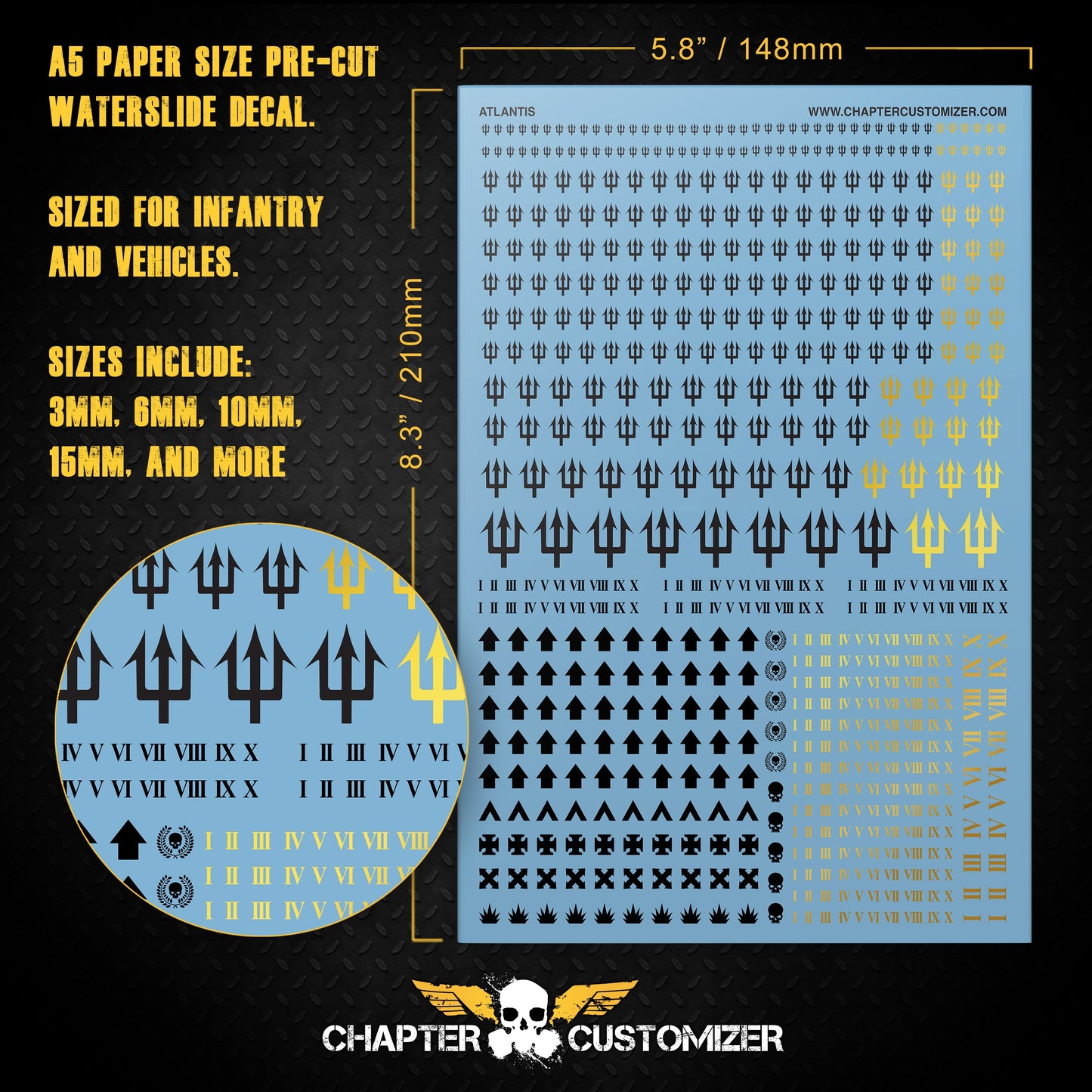 Cette feuille de décalcomanies pour toboggan aquatique prédécoupée au format A5 est conçue pour vous permettre de mettre à niveau et de personnaliser vos modèles miniatures. Ces feuilles de décalcomanies polyvalentes comprennent un assortiment de décalcomanies de la taille d'une infanterie et d'un véhicule ainsi que des marquages et des chiffres d'escouade pour permettre une mise à niveau complète de la miniature.
