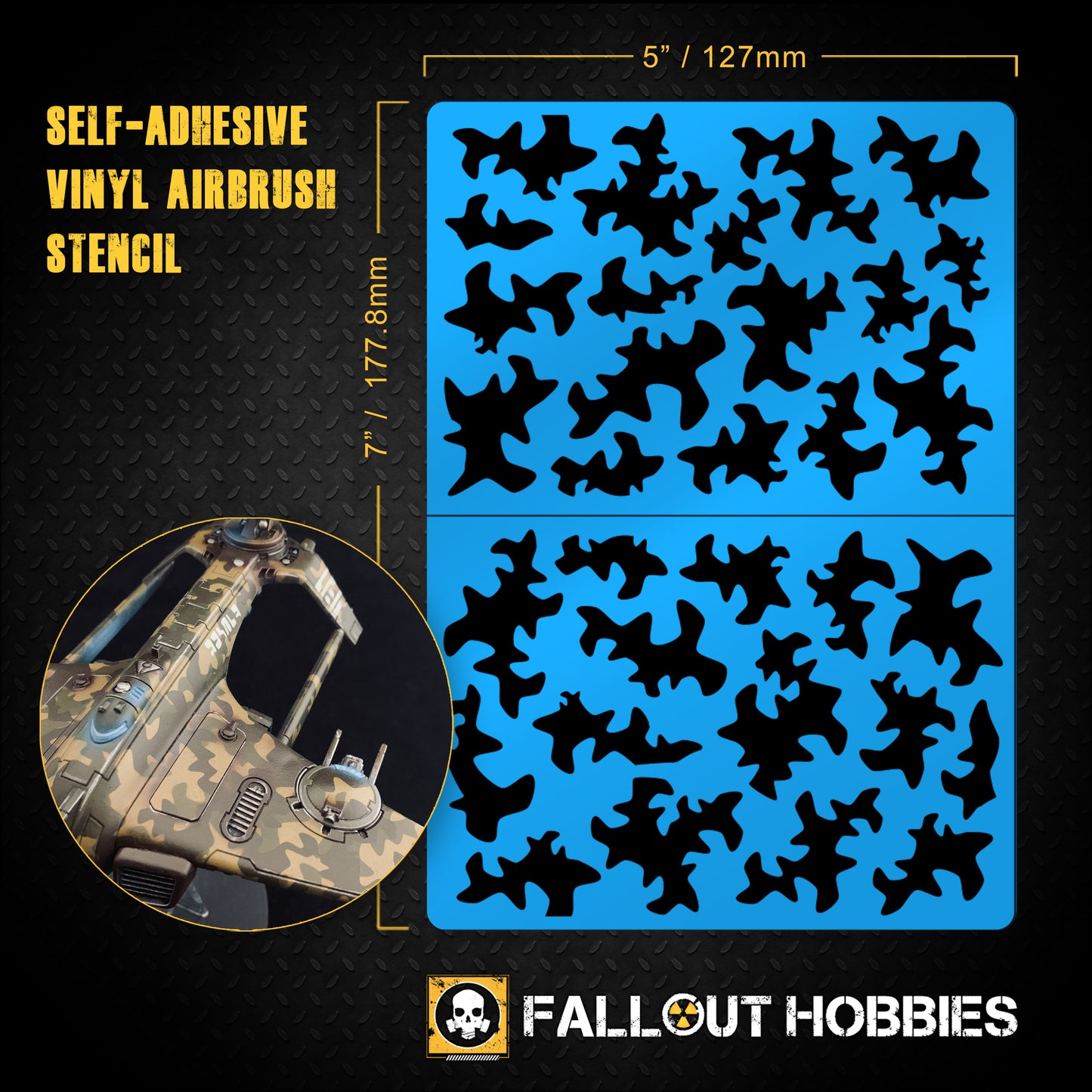 Les pochoirs aérographe Fallout Hobbies sont tous produits sur du vinyle de masque de peinture blanc adhésif de haute qualité et à faible adhérence. Ils sont durables et dureront de multiples utilisations avec un entretien et un retrait appropriés.