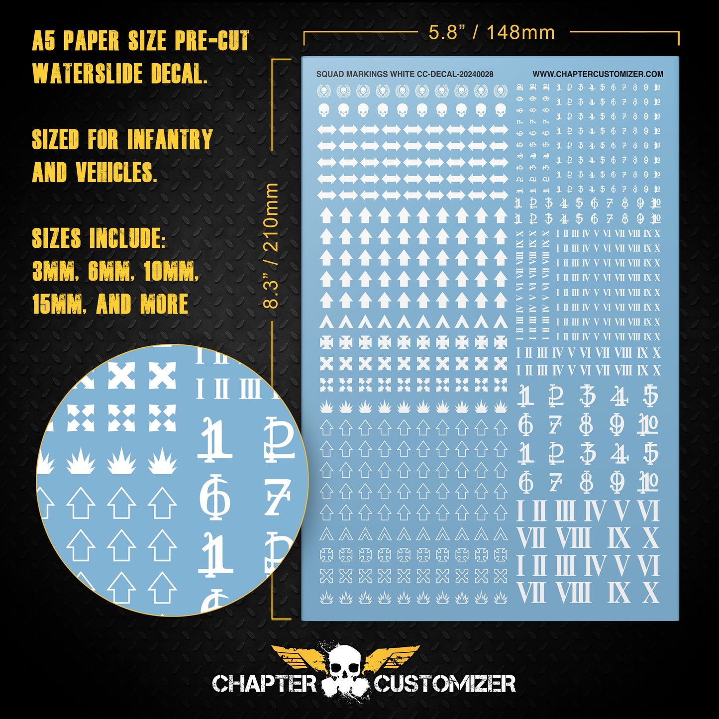Cette feuille de décalcomanies pour toboggan aquatique prédécoupée au format A5 est conçue pour vous permettre de mettre à niveau et de personnaliser vos modèles miniatures. Ces feuilles de décalcomanies polyvalentes comprennent un assortiment de décalcomanies de la taille d'une infanterie et d'un véhicule ainsi que des marquages et des chiffres d'escouade pour permettre une mise à niveau complète de la miniature.