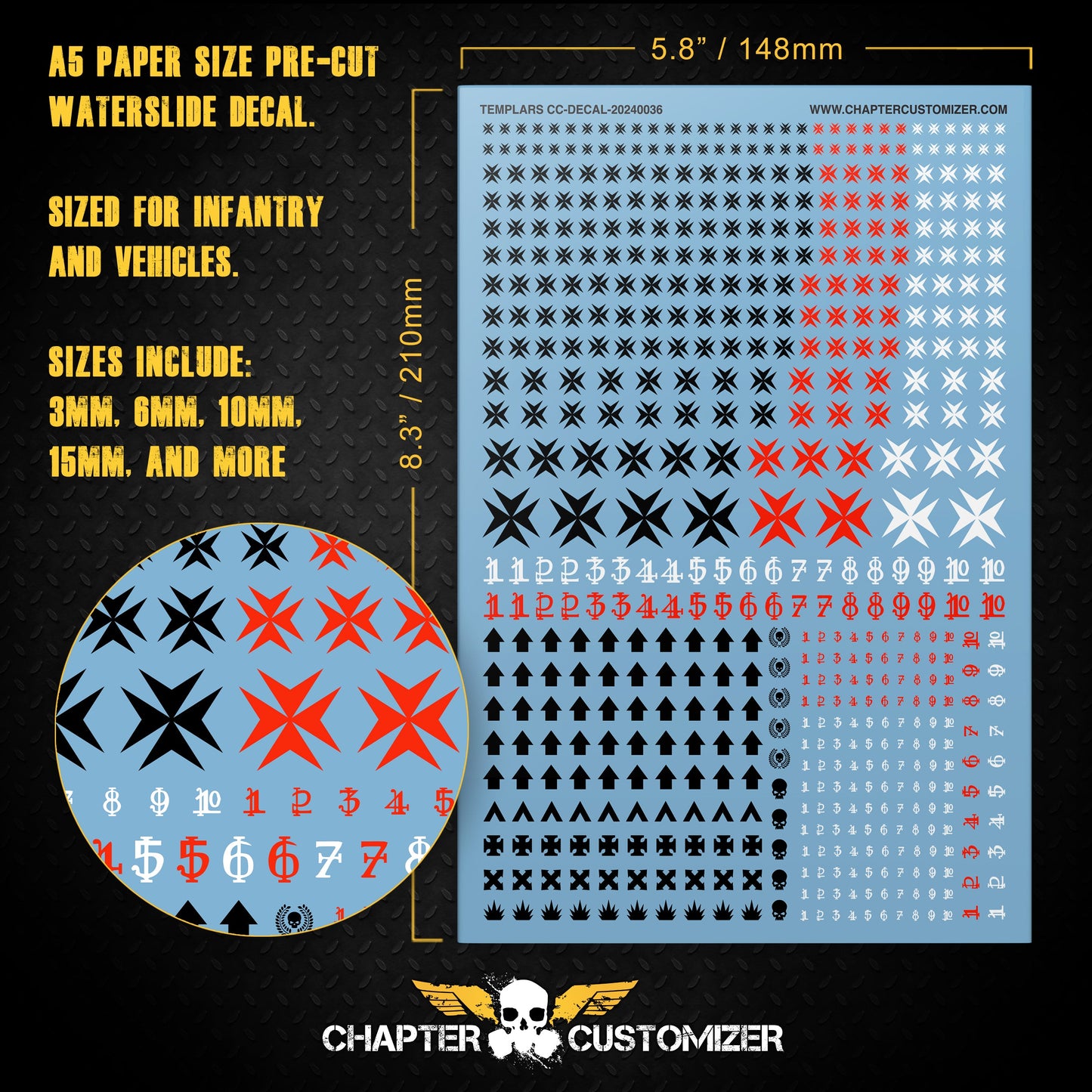 Cette feuille de décalcomanies pour toboggan aquatique prédécoupée au format A5 est conçue pour vous permettre de mettre à niveau et de personnaliser vos modèles miniatures. Ces feuilles de décalcomanies polyvalentes comprennent un assortiment de décalcomanies de la taille d'une infanterie et d'un véhicule ainsi que des marquages et des chiffres d'escouade pour permettre une mise à niveau complète de la miniature.