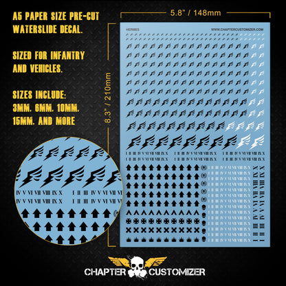 This A5 sized, pre-cut waterslide decal sheet is designed to allow you to upgrade and customize your miniature models. These versatile decal sheets include an assortment of infantry and vehicle sized decals as well as squad markings and numerals to allow for a complete miniature upgrade.